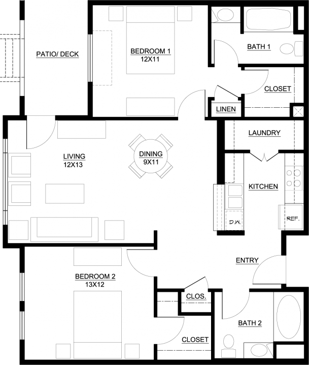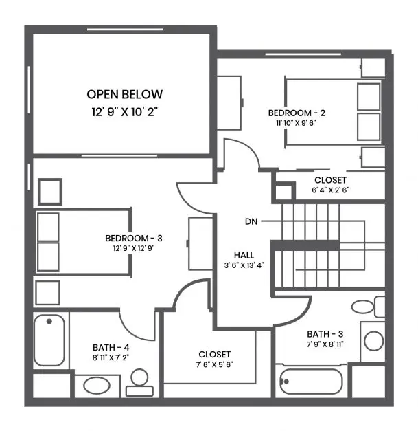Bedroom 1 - 12’ × 13’ Bedroom 2 - 12’ × 13 Bedroom 3 - 11’ × 14’